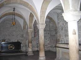 { VAULT } Double definition. A verb meaning to clear an obstacle by jumping over it, and a chamber, often underground, typically with an arched ceiling.