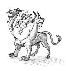 { CHIMERA } An abbreviation for child followed by an anagram (being naughty) of MARIE. A mythological monster containing part of a lion a snake and a goat.